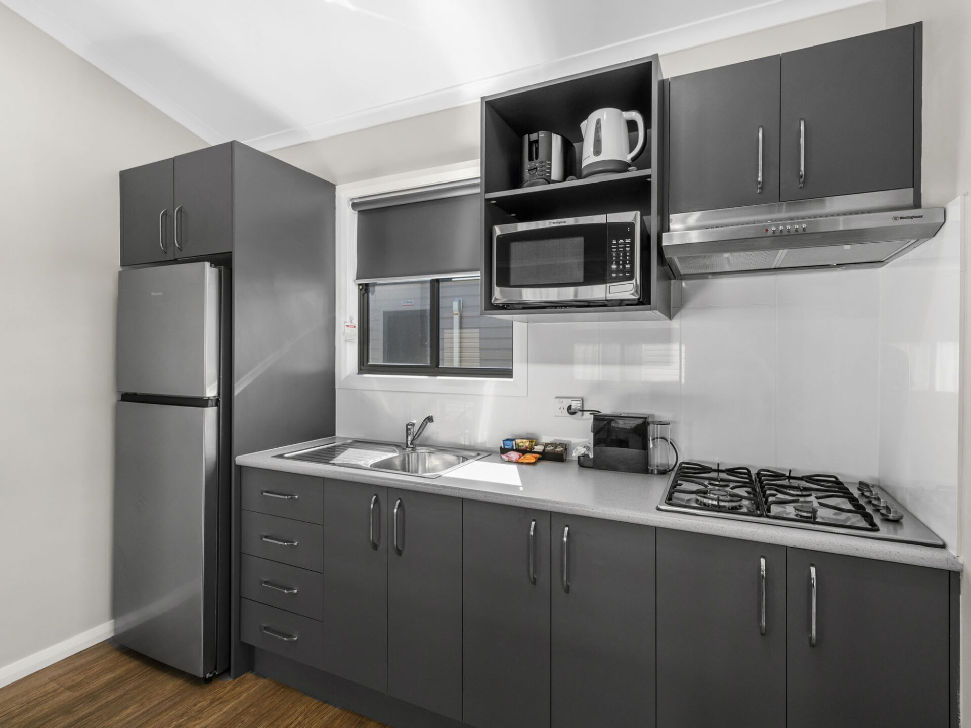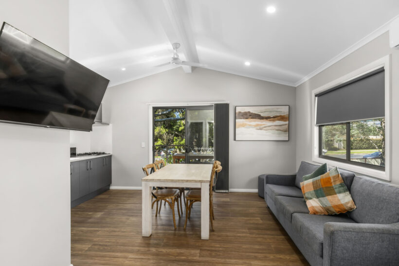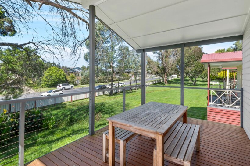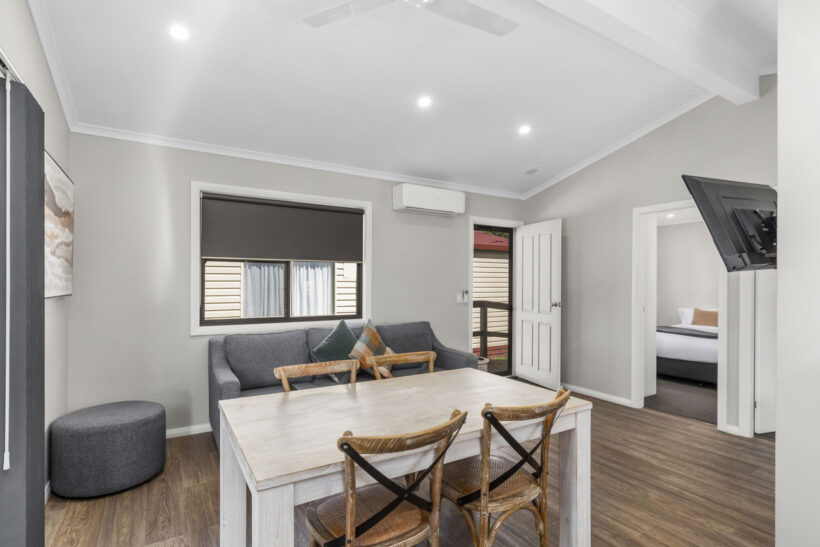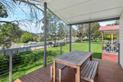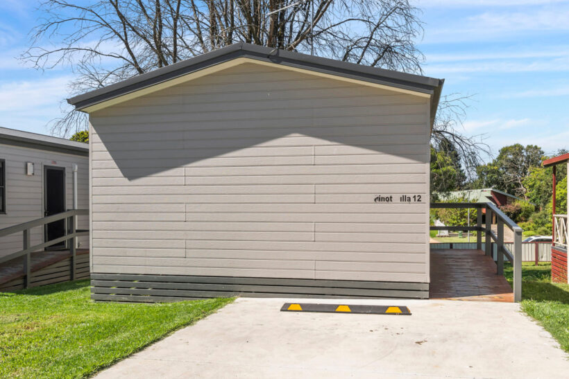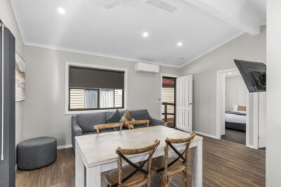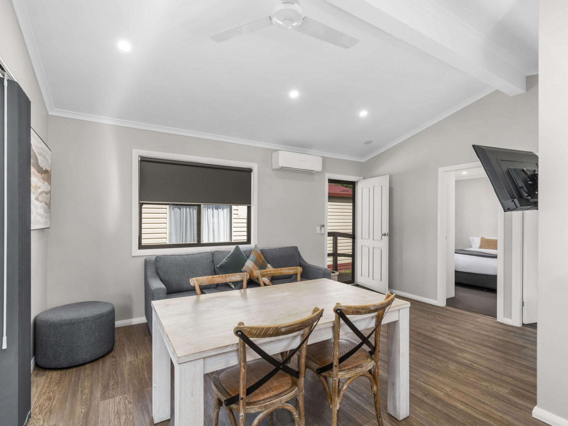 2 double bedrooms sleeping up to 4 guests. Premium soft top double beds, each with electric blankets, extra blankets for warmth and premium pillows are all provided. Both rooms have built in wardrobes. Bedroom 1 has a ceiling fan. Linen and towels are supplied for the number of guests booked in. The living room has a comfortable lounge and ottoman, dining table and chairs for 4, large LCD TV, ceiling fan and climate control air conditioning. There is a fully equipped kitchen including a large fridge/freezer, gas stove top and premium coffee machine. A large outdoor veranda with teak table and bench seats overlook the gardens. Car parking for 1 car, is located next to each villa. There is a ramp to the main entrance, allowing for easy access.