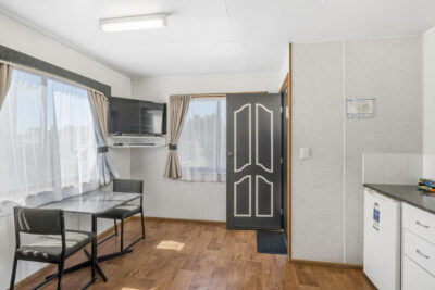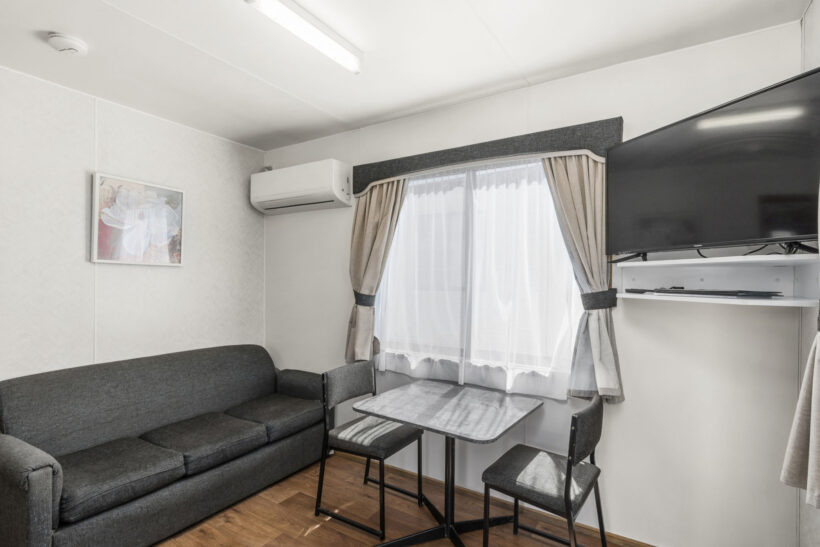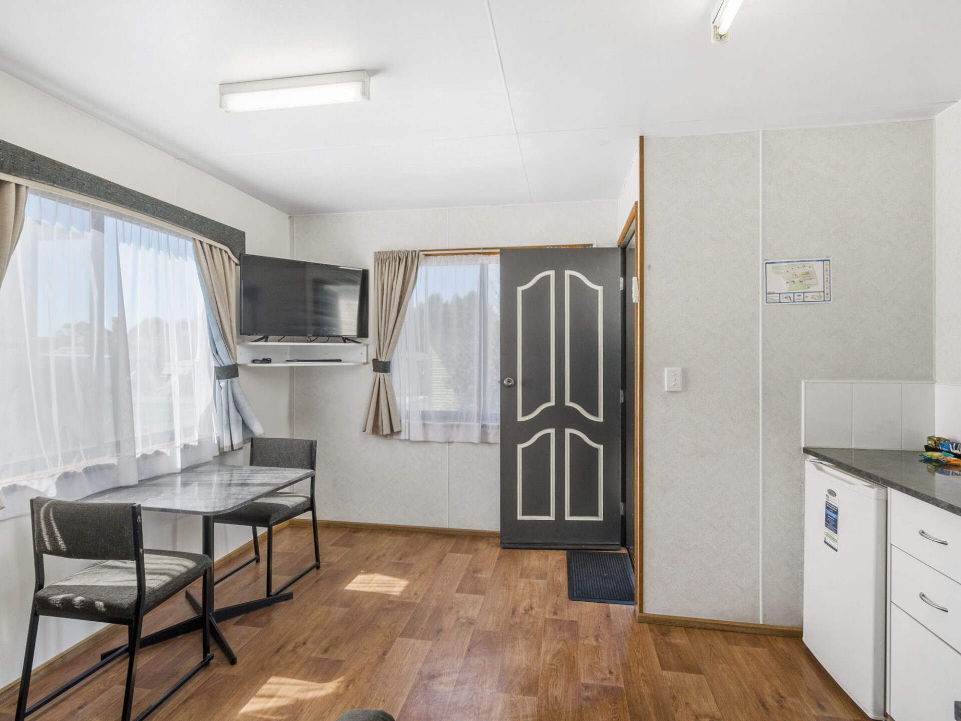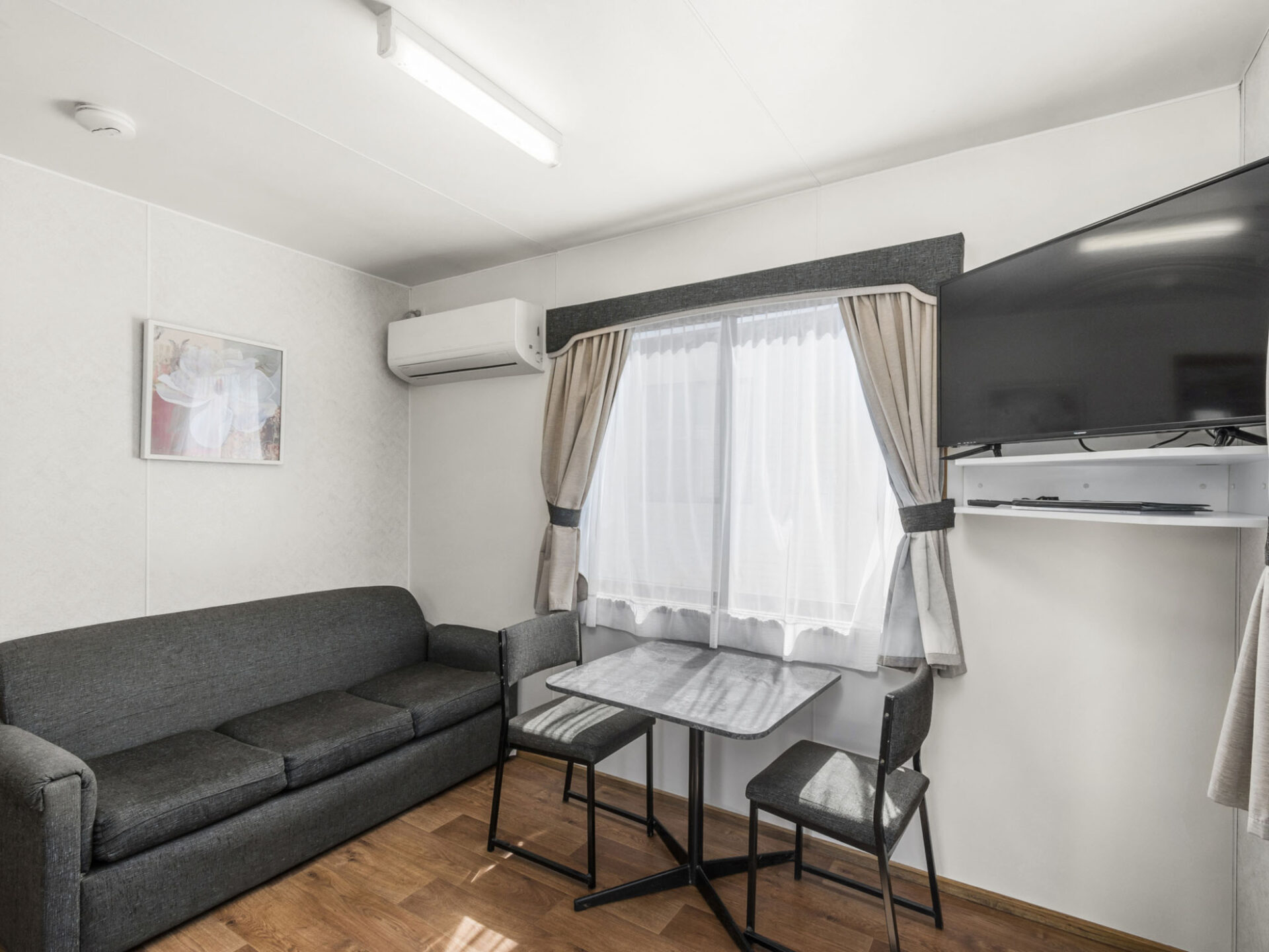 Ideal for couples or solo travellers, this one-bedroom cabin features a queen bed and sleeps up to two guests. It includes a private bathroom, air conditioning, TV, and a dining area. A simple kitchenette with an electric stovetop is available for preparing light meals during your stay.