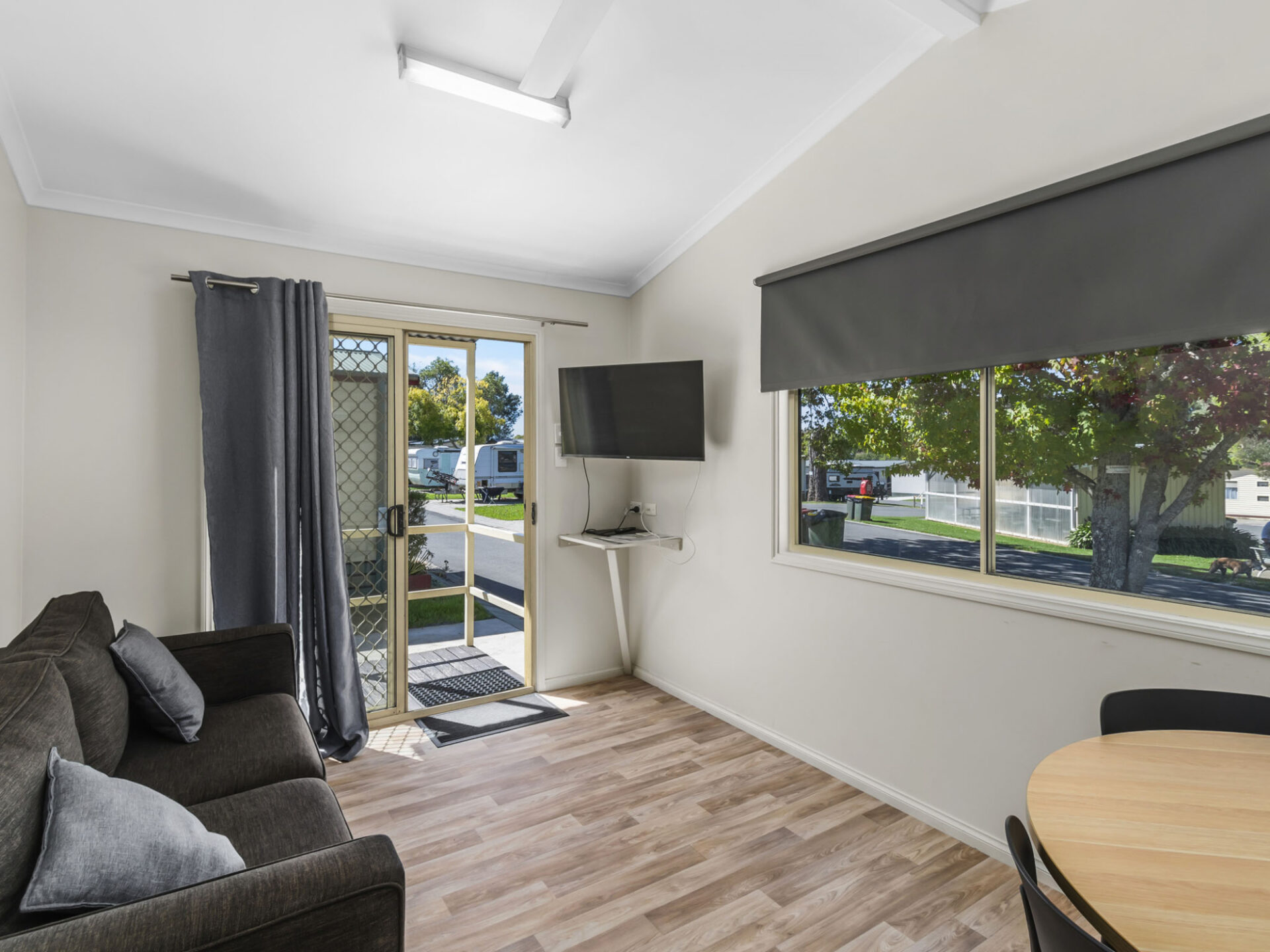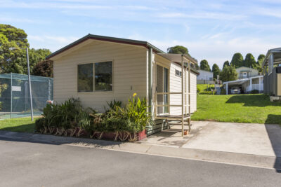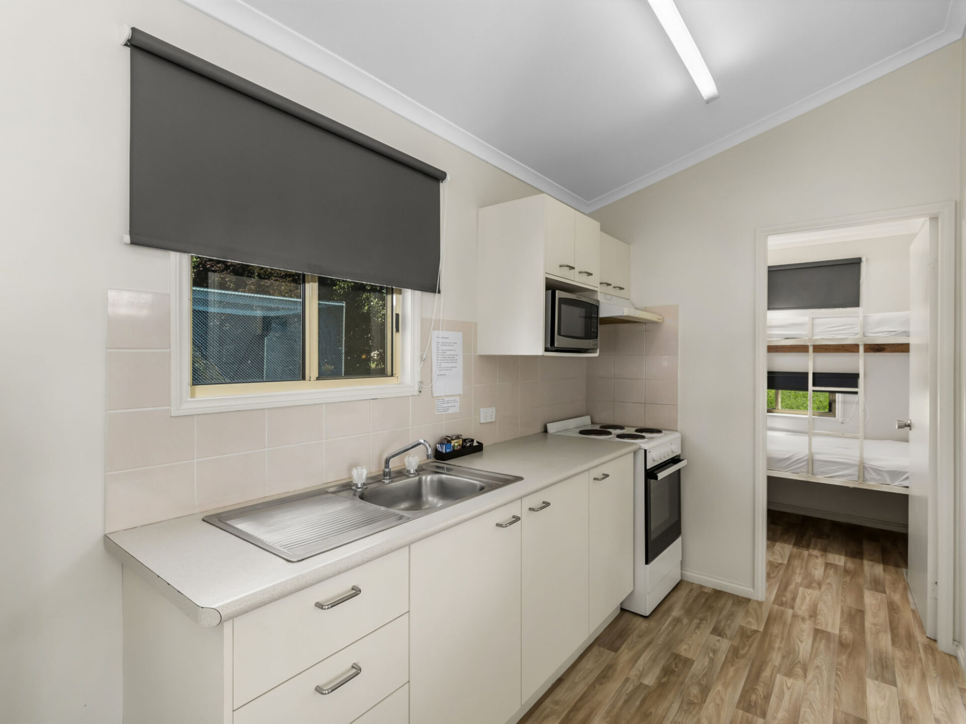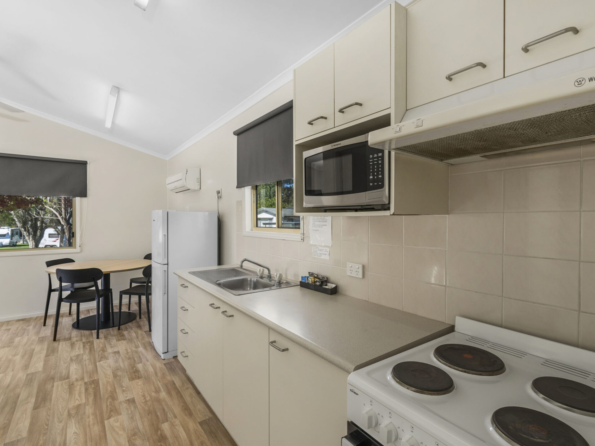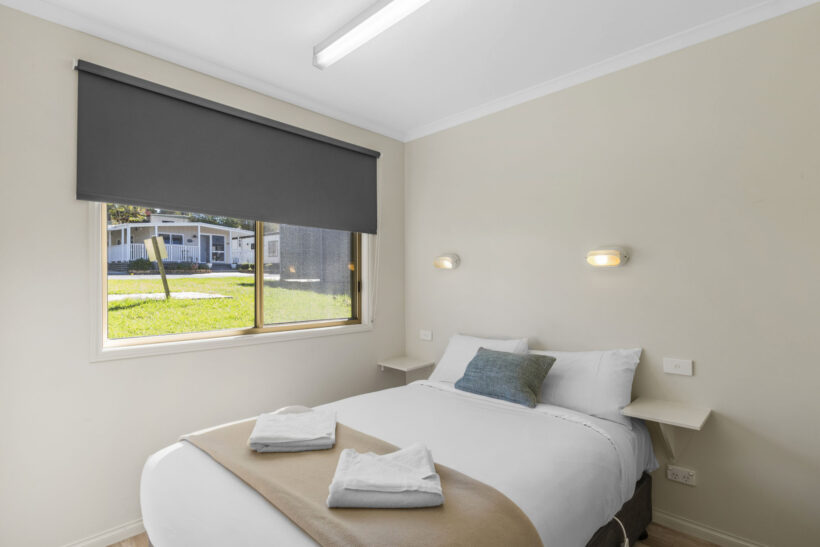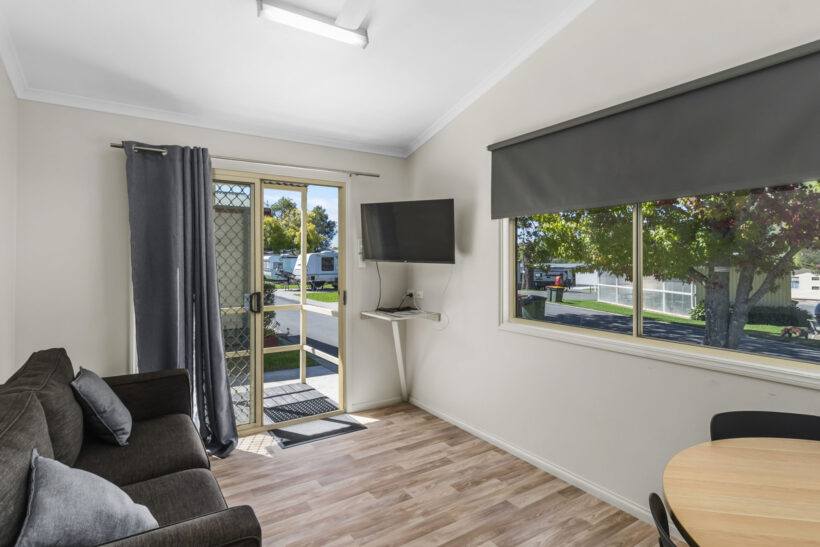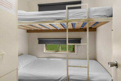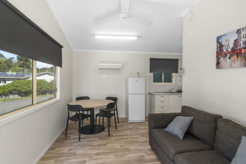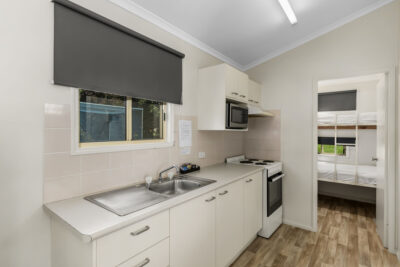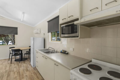 This standard two-bedroom cabin sleeps up to three guests with a double bed and a single bed. It features a full kitchen with electric oven, stovetop, microwave, and fridge, plus a dining area for shared meals. Air conditioning, TV, and a private bathroom offer a comfortable base for budget-conscious travellers.