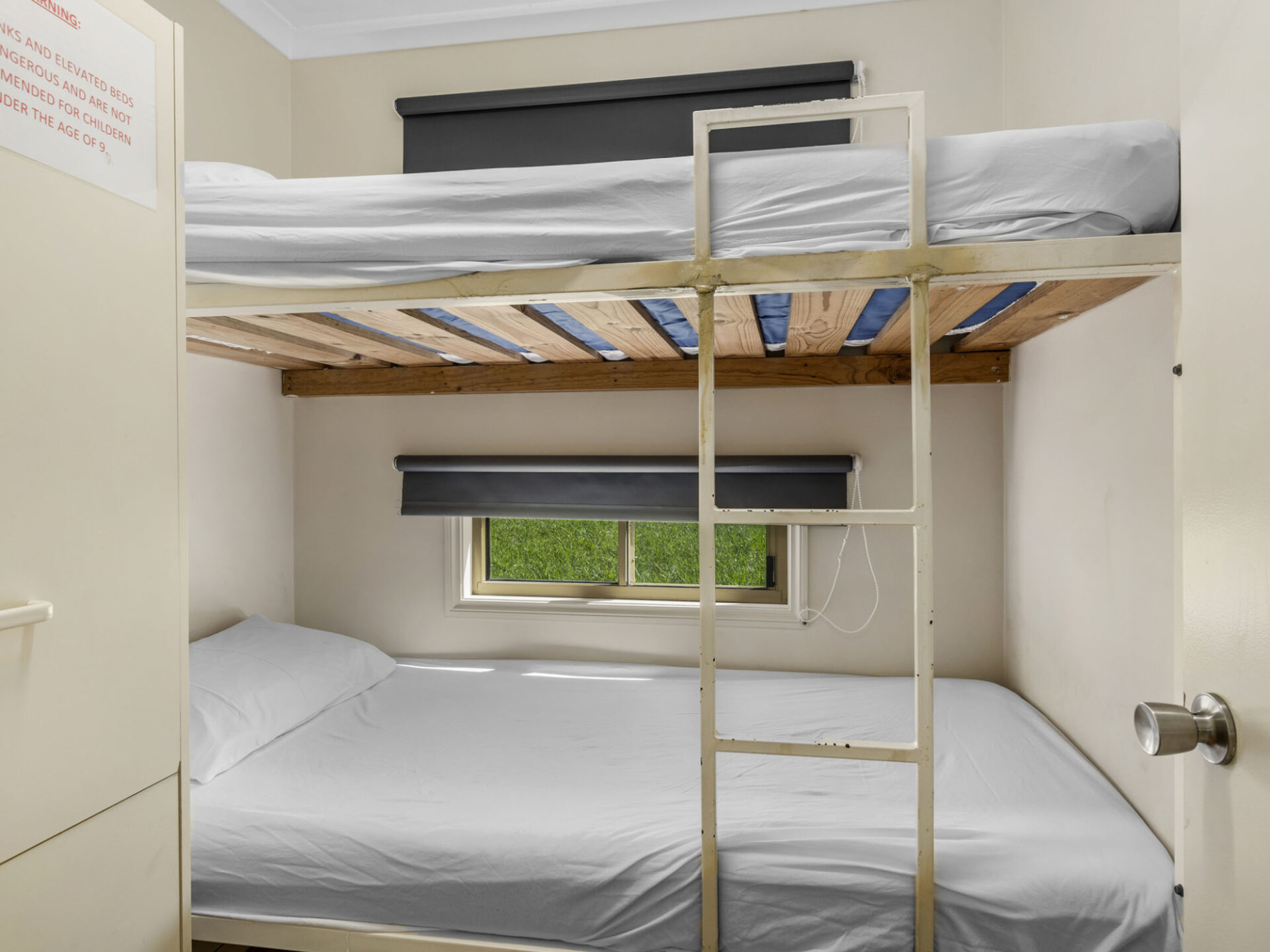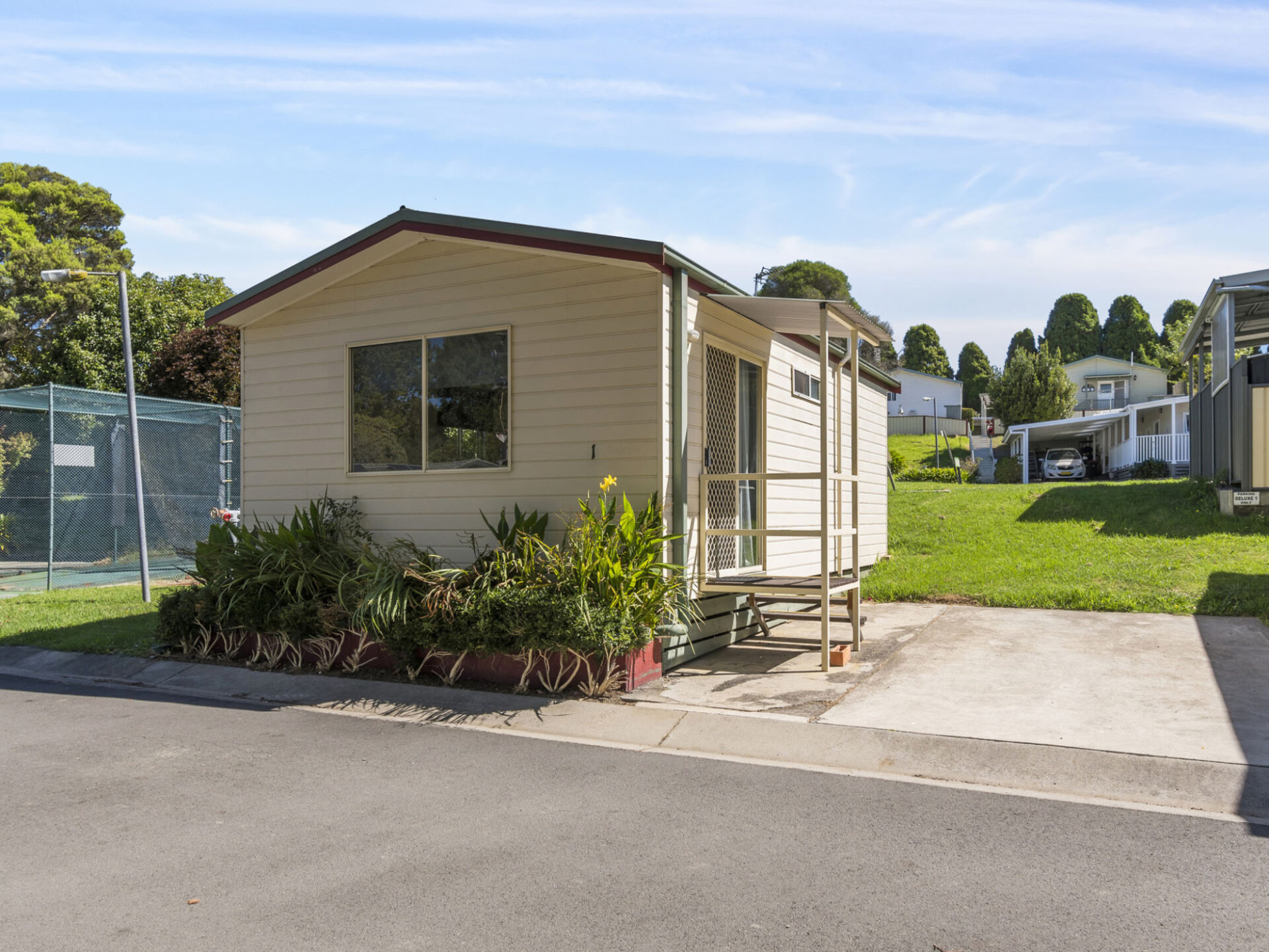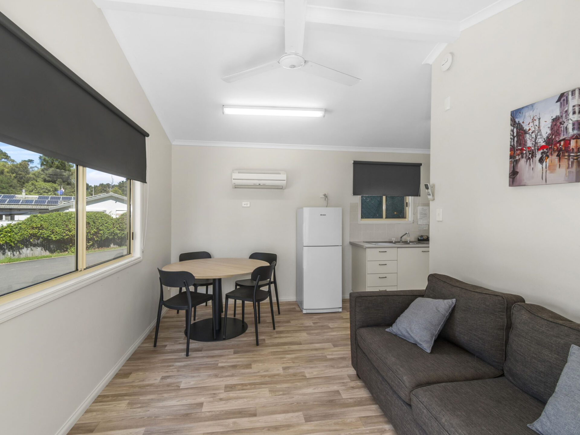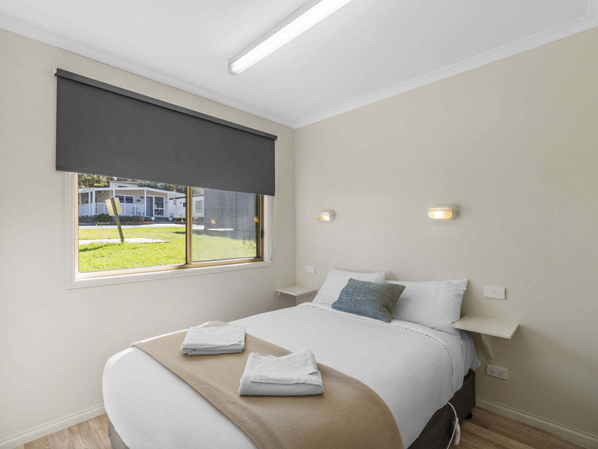 This standard two-bedroom cabin sleeps up to three guests with a double bed and a single bed. It features a full kitchen with electric oven, stovetop, microwave, and fridge, plus a dining area for shared meals. Air conditioning, TV, and a private bathroom offer a comfortable base for budget-conscious travellers.