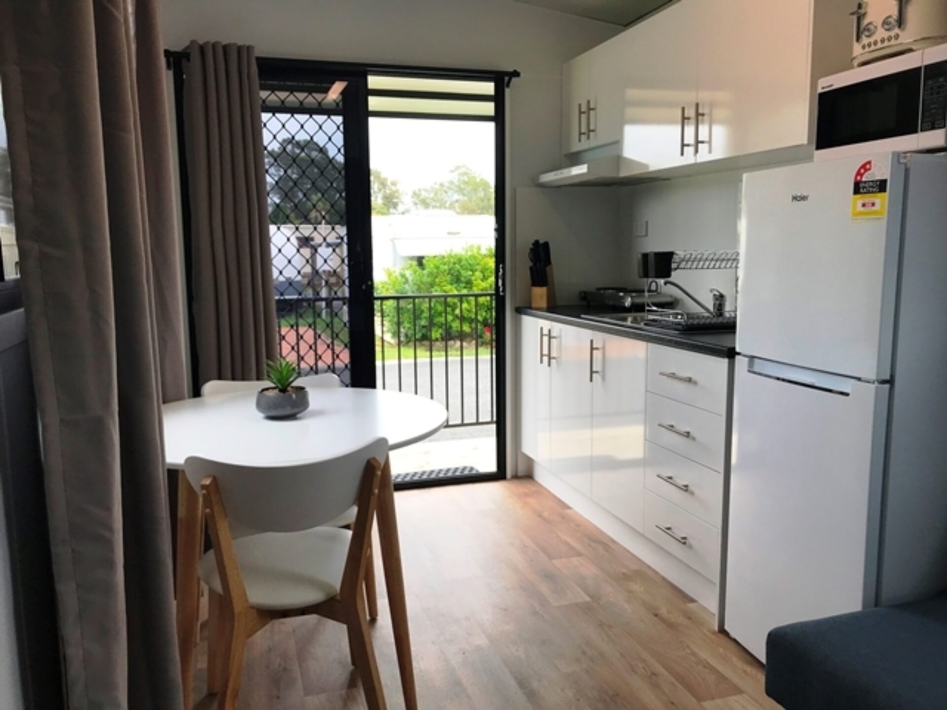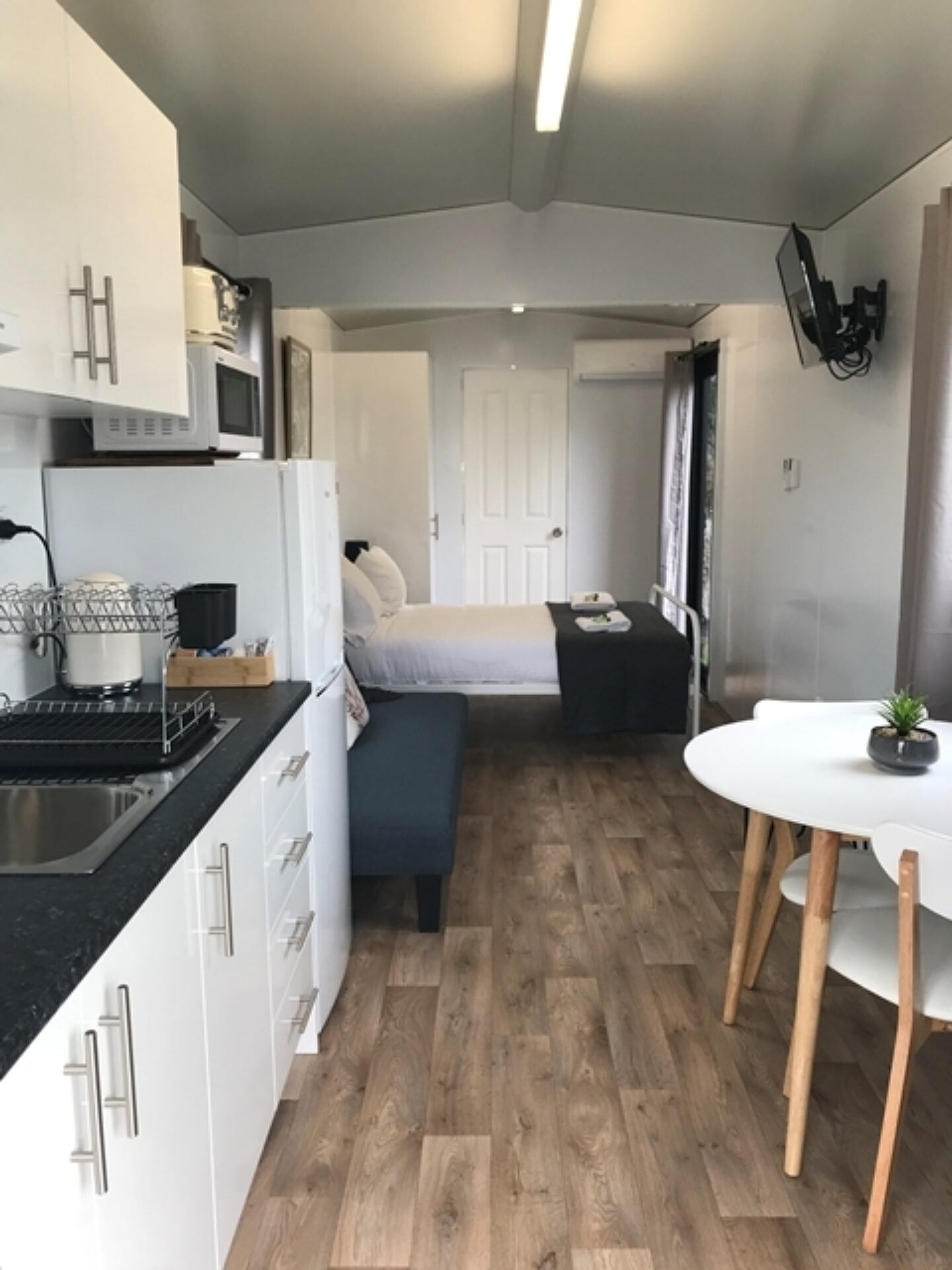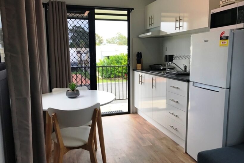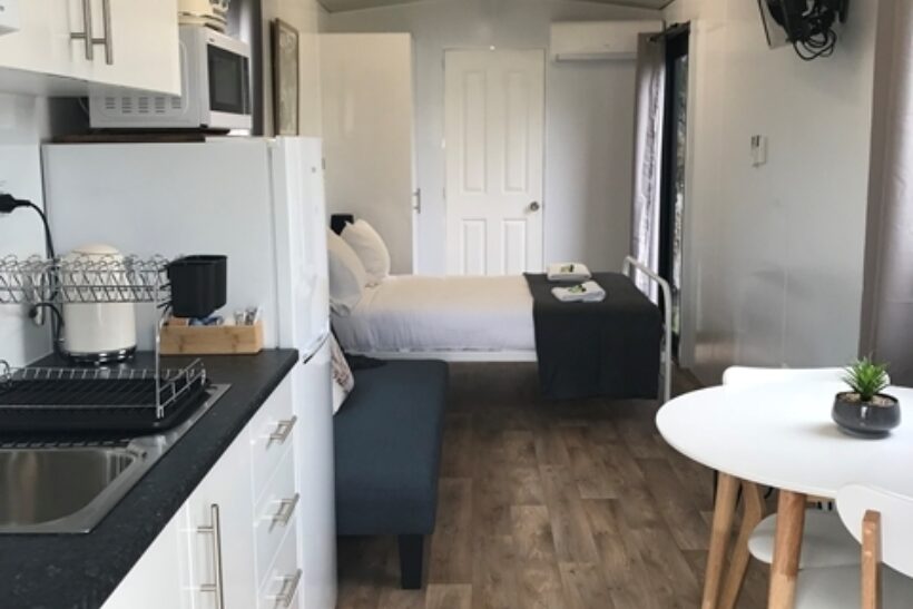 Ideal for couples or small families, this standard studio offers open-plan comfort with a double bed and sofa bed, sleeping three. It includes a kitchenette with electric cooktop, full-sized fridge, microwave, private bathroom, dining area, TV, and air conditioning—perfect for a relaxed beachside escape.